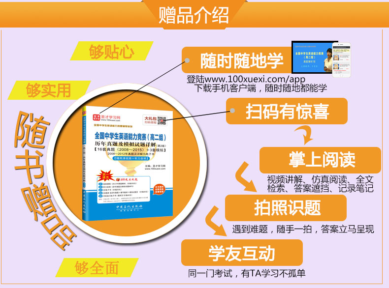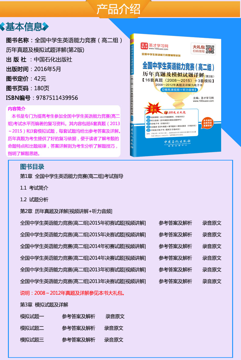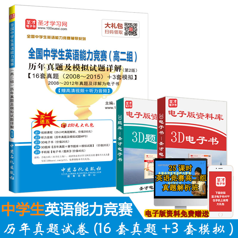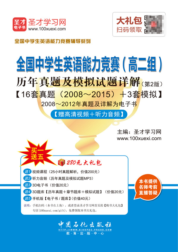 圣才学习网(www.100xuexi.com)提供全国中学生英语能力竞赛考试辅导方案【视频课程、3D电子书、3D题库等】。购书享受大礼包增值服务【200元视频课程+20元3D电子书+20元3D题库+40元手机版电子书/题库】。本书提供名师考前直播答疑,手机电脑均可观看,直播答疑在考前推出(具体时间见网站公告)。手机扫码(本书封面的二维码),或者登录圣才学习网首页的【购书大礼包】专区(100xuexi.com/gift),免费领取本书大礼包。