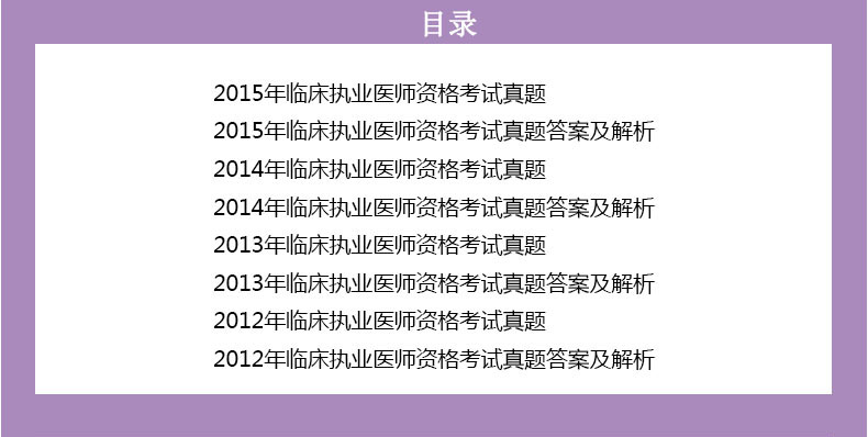 2015年临床执业医师资格考试真题 2015年临床执业医师资格考试真题答案及解析 2014年临床执业医师资格考试真题 2014年临床执业医师资格考试真题答案及解析 2013年临床执业医师资格考试真题 2013年临床执业医师资格考试真题答案及解析 2012年临床执业医师资格考试真题 2012年临床执业医师资格考试真题答案及解析