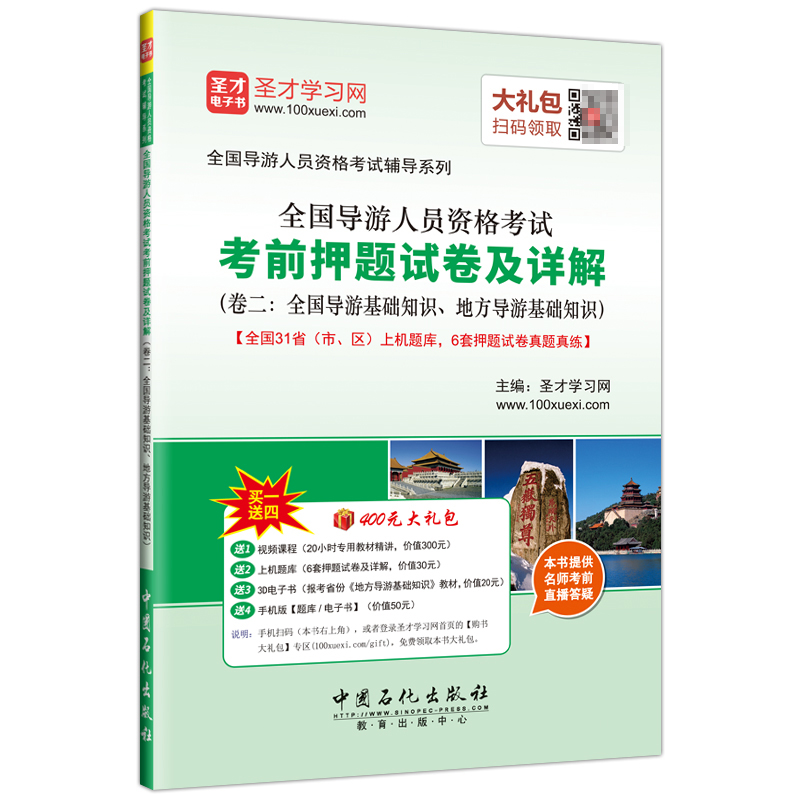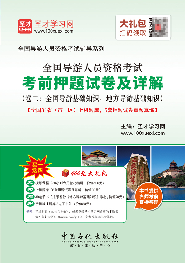 圣才学习网(www.100xuexi.com)提供全国导游人员资格考试辅导方案【视频课程、3D电子书、上机题库等】。购书享受大礼包增值服务【300元视频课程(20小时专用教材精讲)+30元上机题库(6套押题试卷及详解)+20元3D电子书(报考省份《地方导游基础知识》教材)+50元手机版题库/电子书】。本书提供名师考前直播答疑,手机电脑均可观看,直播答疑在考前推出(具体时间见网站公告)。手机扫码(本书封面的二维码),或者登录圣才学习网首页的【购书大礼包】专区(100xuexi.com/gift),免费领取本书大礼包。