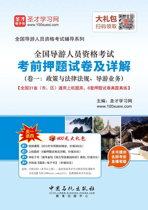圣才学习网(www.100xuexi.com)提供全国导游人员资格考试辅导方案【视频课程、3D电子书、上机题库等】。购书享受大礼包增值服务【300元视频课程(20小时专用教材精讲)+30元上机题库(6套押题试卷及详解)+20元3D电子书(报考省份《地方导游基础知识》教材)+50元手机版题库/电子书】。本书提供名师考前直播答疑,手机电脑均可观看,直播答疑在考前推出(具体时间见网站公告)。手机扫码(本书封面的二维码),或者登录圣才学习网首页的【购书大礼包】专区(100xuexi.com/gift),免费领取本书大礼包。