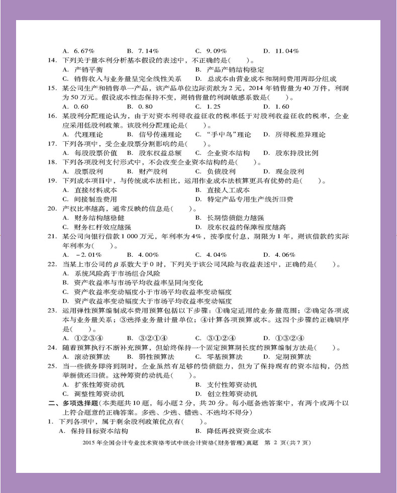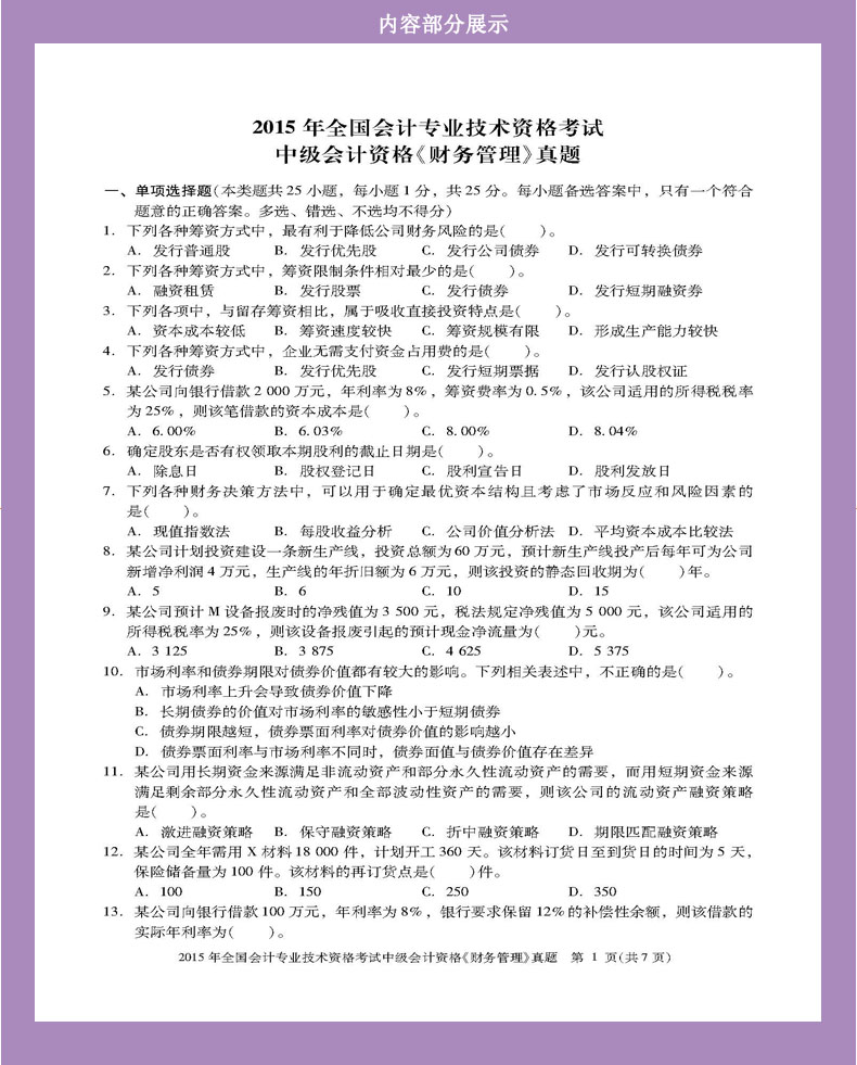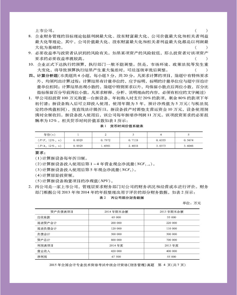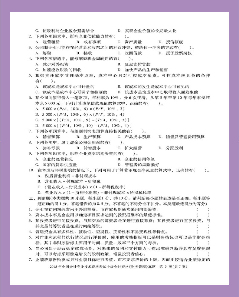 2015年全国会计专业技术资格考试中级会计资格《财务管理》真题