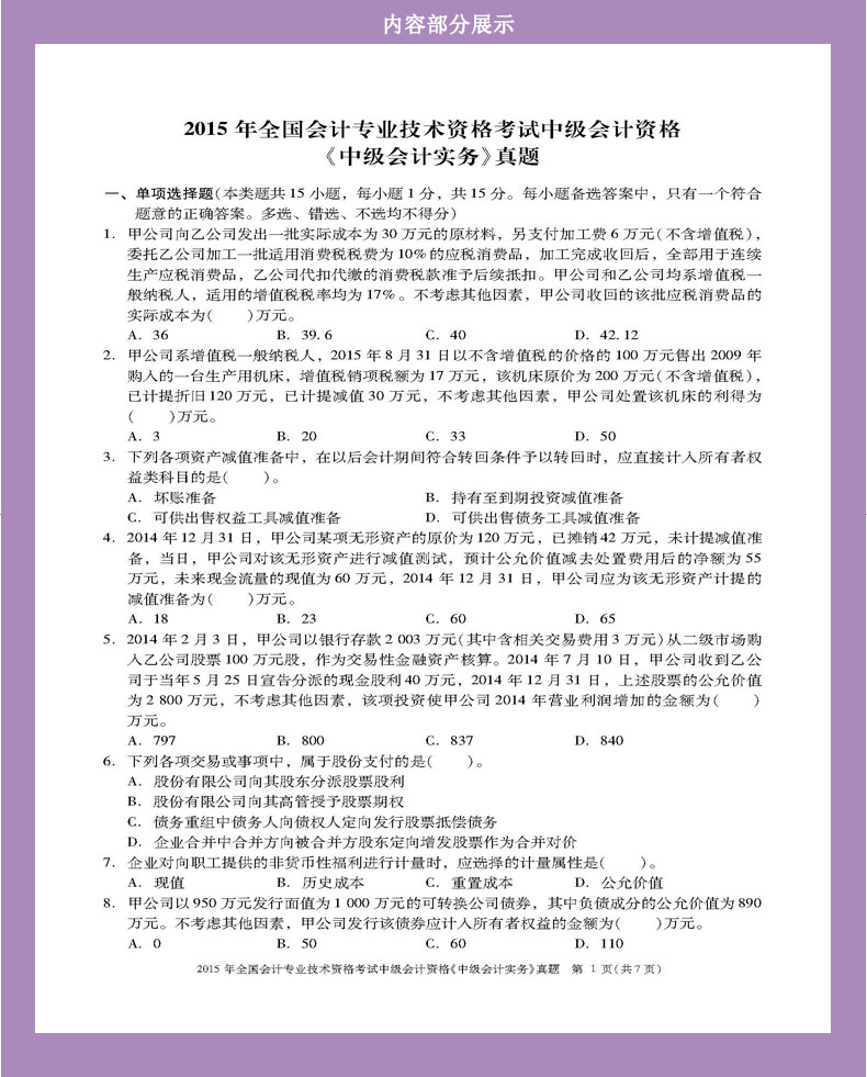 2015年全国会计专业技术资格考试中级会计资格《中级会计实务》真题答案及详解