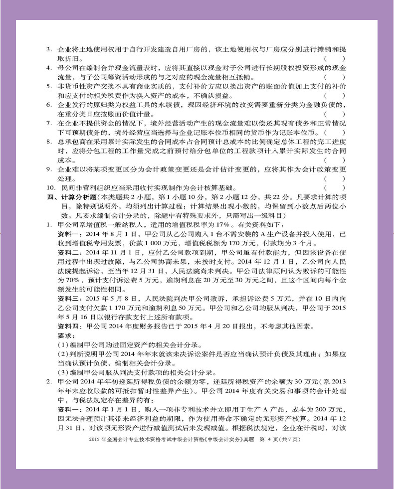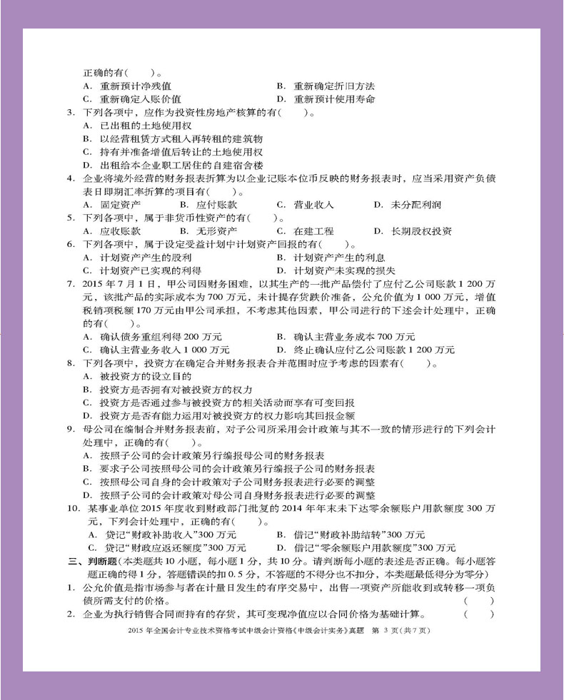 2015年全国会计专业技术资格考试中级会计资格《中级会计实务》真题
