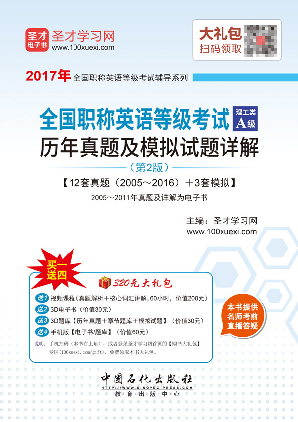 圣才学习网│英语类(www.100xuexi.com)提供全国职称英语等级考试辅导方案【视频课程、3D电子书、3D题库等】。购书享受大礼包增值服务【200元视频课程+30元3D电子书+30元3D题库+60元手机版电子书/题库】。本书提供名师考前直播答疑,手机电脑均可观看,直播答疑在考前推出(具体时间见网站公告)。手机扫码(本书封面的二维码),或者登录圣才学习网首页的【购书大礼包】专区(100xuexi.com/gift),免费领取本书大礼包。