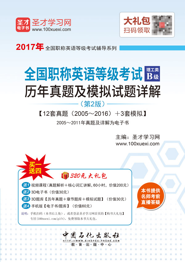 圣才学习网│英语类(www.100xuexi.com)提供全国职称英语等级考试辅导方案【视频课程、3D电子书、3D题库等】。购书享受大礼包增值服务【200元视频课程+30元3D电子书+30元3D题库+60元手机版电子书/题库】。本书提供名师考前直播答疑,手机电脑均可观看,直播答疑在考前推出(具体时间见网站公告)。手机扫码(本书封面的二维码),或者登录圣才学习网首页的【购书大礼包】专区(100xuexi.com/gift),免费领取本书大礼包。