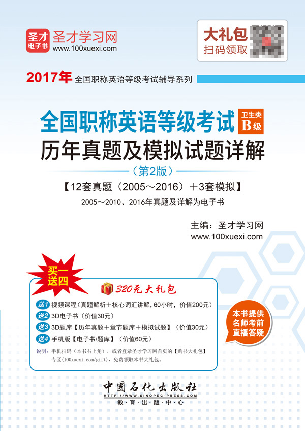 圣才学习网│英语类(www.100xuexi.com)提供全国职称英语等级考试辅导方案【视频课程、3D电子书、3D题库等】。购书享受大礼包增值服务【200元视频课程+30元3D电子书+30元3D题库+60元手机版电子书/题库】。本书提供名师考前直播答疑,手机电脑均可观看,直播答疑在考前推出(具体时间见网站公告)。手机扫码(本书封面的二维码),或者登录圣才学习网首页的【购书大礼包】专区(100xuexi.com/gift),免费领取本书大礼包。