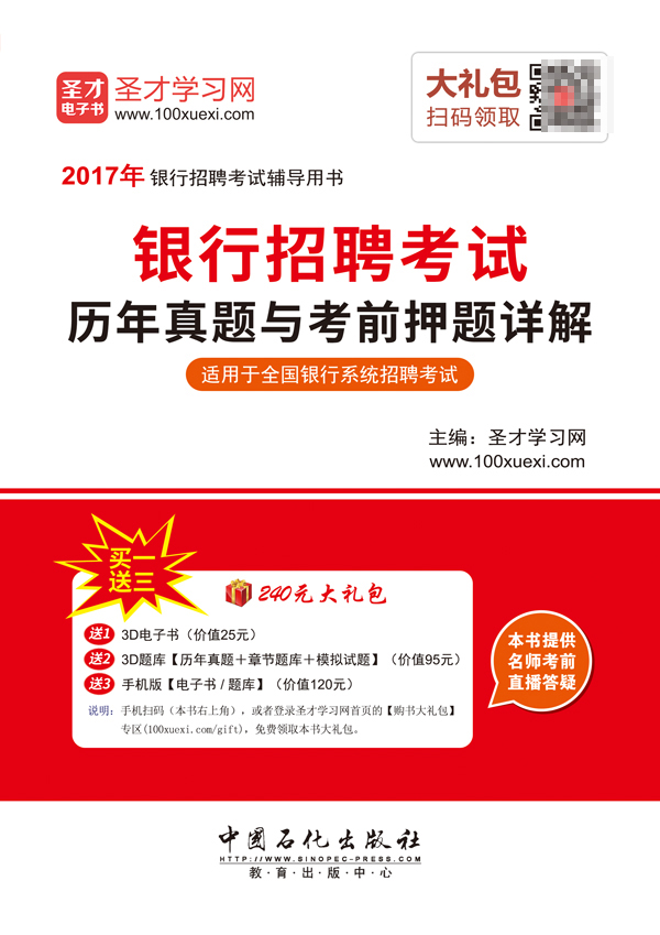 圣才学习网(www.100xuexi.com)提供银行招聘考试等各种考试辅导方案【网络课程、3D电子书、3D题库等】。购书享受大礼包增值服务【25元3D电子书+95元3D题库+120元手机版电子书/题库】。本书提供名师考前直播答疑,手机电脑均可观看,直播答疑在考前推出(具体时间见网站公告)。手机扫码(本书封面的二维码),或者登录圣才学习网首页的【购书大礼包】专区(www.100xuexi.com/gift),免费领取本书大礼包。