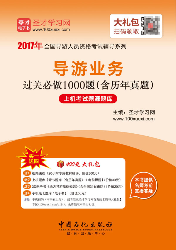 圣才学习网(www.100xuexi.com)提供全国导游人员资格考试辅导方案【视频课程、3D电子书、上机题库等】。购书享受大礼包增值服务【300元视频课程+30元上机题库+20元3D电子书+50元手机版题库/电子书】。本书提供名师考前直播答疑,手机电脑均可观看,直播答疑在考前推出(具体时间见网站公告)。手机扫码(本书封面的二维码),或者登录圣才学习网首页的【购书大礼包】专区(100xuexi.com/gift),免费领取本书大礼包。