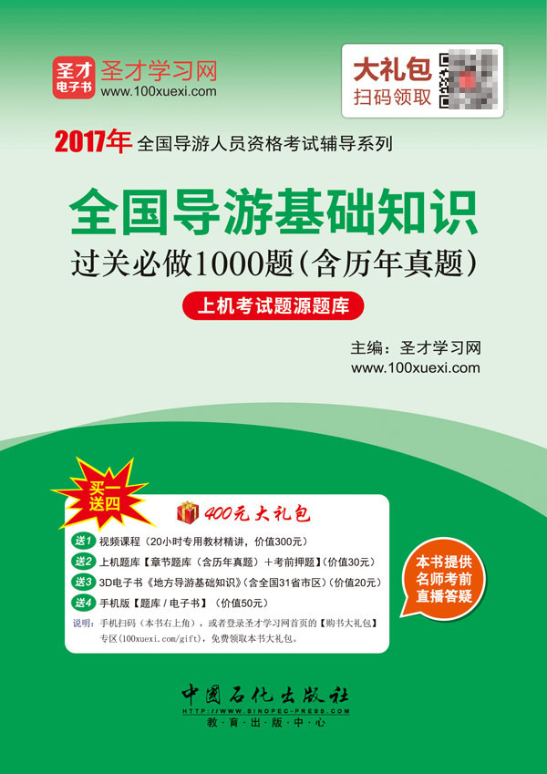 圣才学习网(www.100xuexi.com)提供全国导游人员资格考试辅导方案【视频课程、3D电子书、上机题库等】。购书享受大礼包增值服务【300元视频课程+30元上机题库+20元3D电子书+50元手机版题库/电子书】。本书提供名师考前直播答疑,手机电脑均可观看,直播答疑在考前推出(具体时间见网站公告)。手机扫码(本书封面的二维码),或者登录圣才学习网首页的【购书大礼包】专区(100xuexi.com/gift),免费领取本书大礼包。