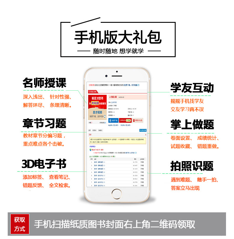 圣才学习网(www.100xuexi.com)提供企业人力资源管理师等各种管理类考试辅导方案【视频课程、3D电子书、3D题库等】。购书享受大礼包增值服务【50元3D电子书+30元3D题库+80元手机版电子书/题库】。本书提供名师考前直播答疑,手机电脑均可观看,直播答疑在考前推出(具体时间见网站公告)。手机扫码(本书封面的二维码),或者登录圣才学习网首页的【购书大礼包】专区(www.100xuexi.com/gift),免费领取本书大礼包。