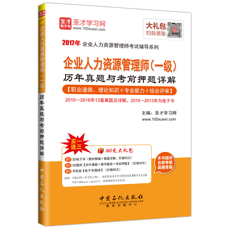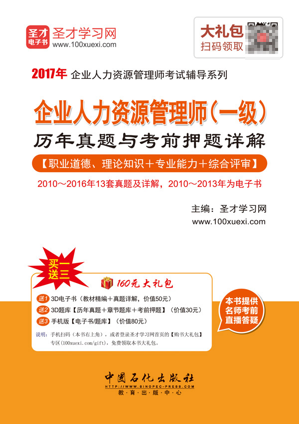 圣才学习网(www.100xuexi.com)提供企业人力资源管理师等各种管理类考试辅导方案【视频课程、3D电子书、3D题库等】。购书享受大礼包增值服务【50元3D电子书+30元3D题库+80元手机版电子书/题库】。本书提供名师考前直播答疑,手机电脑均可观看,直播答疑在考前推出(具体时间见网站公告)。手机扫码(本书封面的二维码),或者登录圣才学习网首页的【购书大礼包】专区(www.100xuexi.com/gift),免费领取本书大礼包。