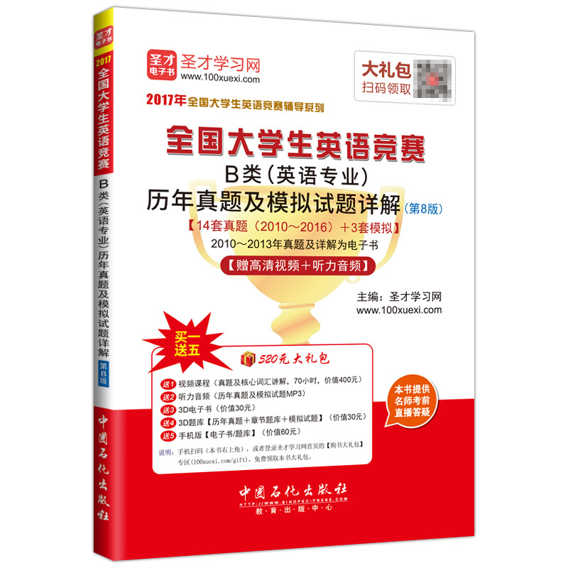 圣才学习网│英语类(www.100xuexi.com)提供全国大学生英语竞赛考试辅导方案【视频课程、3D电子书、3D题库等】。购书享受大礼包增值服务【400元视频课程+30元3D电子书+30元3D题库+60元手机版电子书/题库】。本书提供名师考前直播答疑,手机电脑均可观看,直播答疑在考前推出(具体时间见网站公告)。手机扫码(本书封面的二维码),或者登录圣才学习网首页的【购书大礼包】专区(100xuexi.com/gift),免费领取本书大礼包。