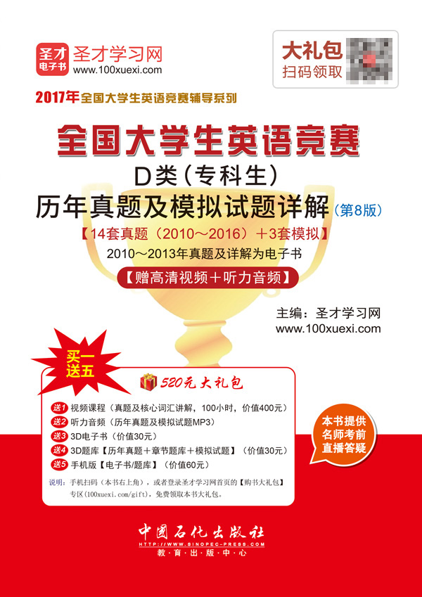 圣才学习网│英语类(www.100xuexi.com)提供全国大学生英语竞赛考试辅导方案【视频课程、3D电子书、3D题库等】。购书享受大礼包增值服务【400元视频课程+30元3D电子书+30元3D题库+60元手机版电子书/题库】。本书提供名师考前直播答疑,手机电脑均可观看,直播答疑在考前推出(具体时间见网站公告)。手机扫码(本书封面的二维码),或者登录圣才学习网首页的【购书大礼包】专区(100xuexi.com/gift),免费领取本书大礼包。