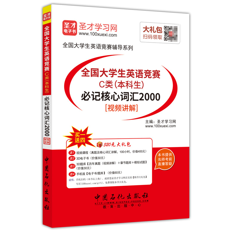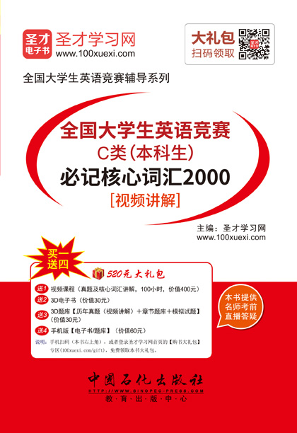 圣才学习网(www.100xuexi.com)提供全国大学生英语竞赛考试辅导方案【视频课程、3D电子书、3D题库等】。购书享受大礼包增值服务【400元视频课程+30元3D电子书+30元3D题库+60元手机版电子书/题库】。本书提供名师考前直播答疑,手机电脑均可观看,直播答疑在考前推出(具体时间见网站公告)。手机扫码(本书封面的二维码),或者登录圣才学习网首页的【购书大礼包】专区(100xuexi.com/gift),免费领取本书大礼包。