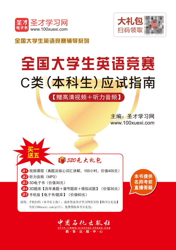 圣才学习网(www.100xuexi.com)提供全国大学生英语竞赛考试辅导方案【视频课程、3D电子书、3D题库等】。购书享受大礼包增值服务【400元视频课程+30元3D电子书+30元3D题库+60元手机版电子书/题库】。本书提供名师考前直播答疑,手机电脑均可观看,直播答疑在考前推出(具体时间见网站公告)。手机扫码(本书封面的二维码),或者登录圣才学习网首页的【购书大礼包】专区(100xuexi.com/gift),免费领取本书大礼包。
