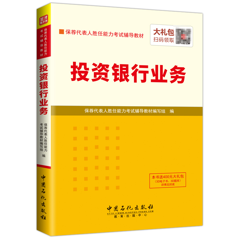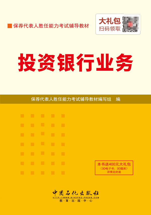 圣才学习网(www.100xuexi.com)提供保荐代表人胜任能力考试辅导方案【视频课程、3D电子书、3D题库等】。购书享受大礼包增值服务【100元3D电子书+100元3D题库+200元手机版电子书/题库】。本书提供名师考前直播答疑,手机电脑均可观看,直播答疑在考前推出(具体时间见网站公告)。手机扫码(本书封面的二维码),或者登录圣才学习网首页的【购书大礼包】专区(www.100xuexi.com/gift),免费领取本书大礼包。