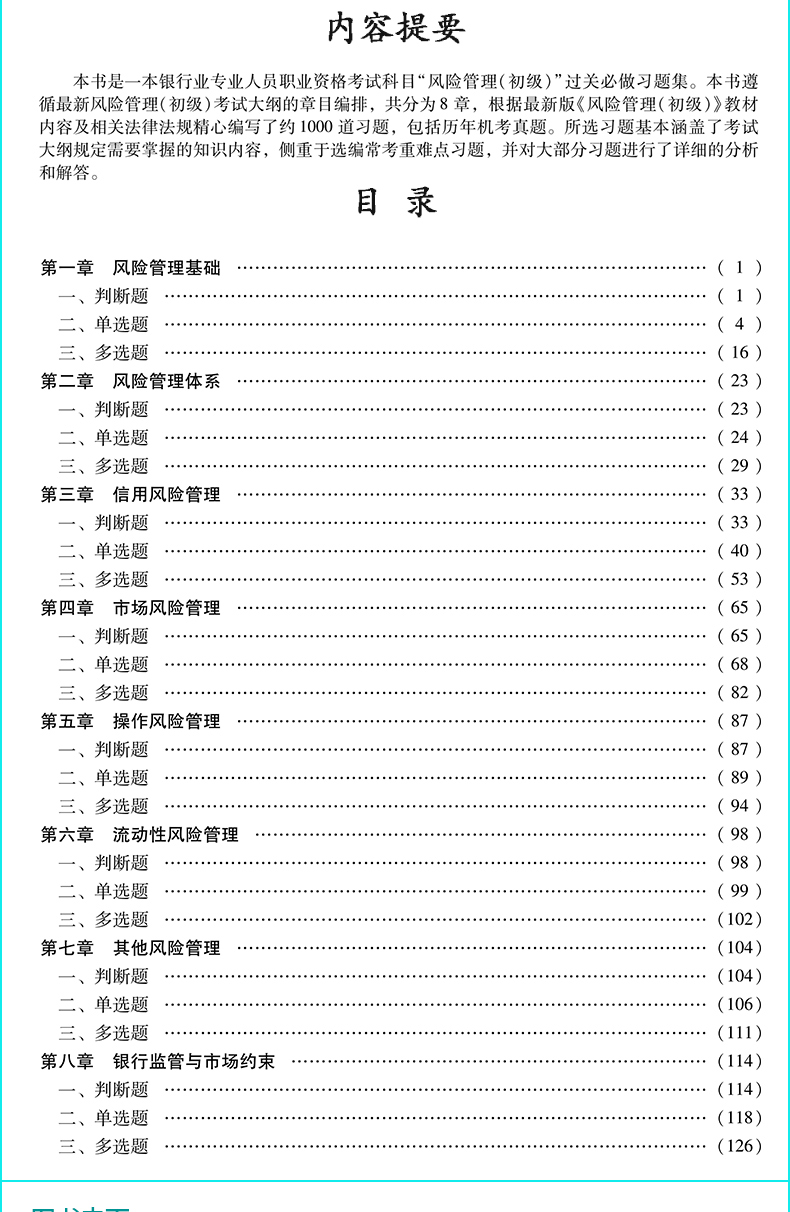 本书是一本银行业专业人员职业资格考试科目“风险管理(初级)”过关必做习题集。本书遵循最新风险管理(初级)考试大纲的章目编排,共分为8章,根据最新版《风险管理(初级)》教材内容及相关法律法规精心编写了约1000道习题,包括历年机考真题。所选习题基本涵盖了考试大纲规定需要掌握的知识内容,侧重于选编常考重难点习题,并对大部分习题进行了详细的分析和解答。