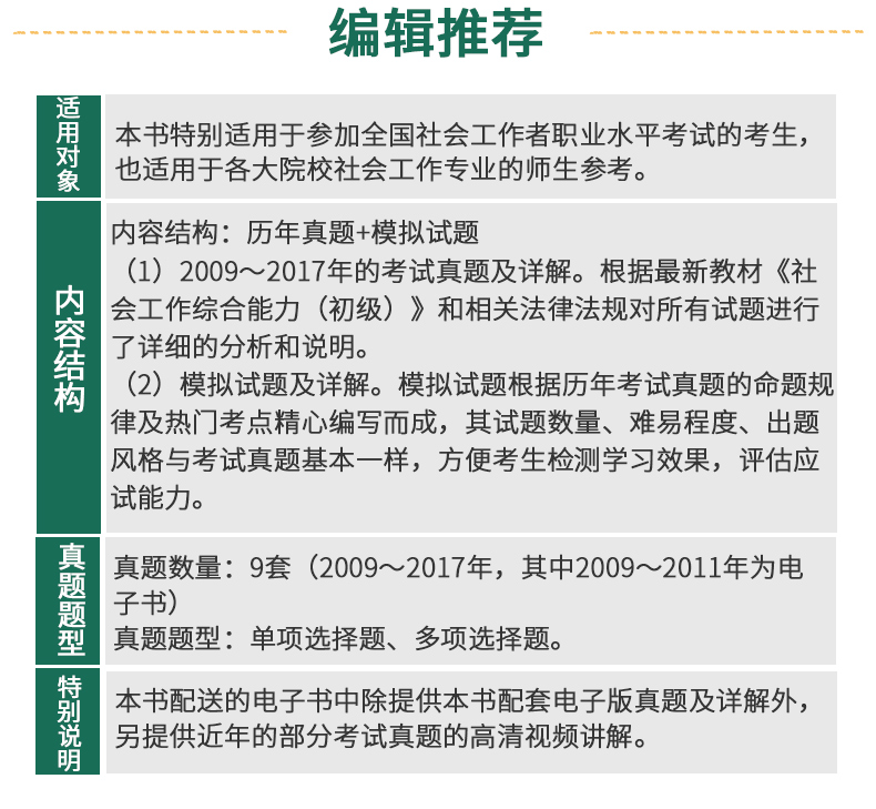 模拟试题由圣才名师根据历年考试真题的命题规律及热门考点进行押题,其试题数量、试题难度、试题风格与社会工作者职业水平考试真题基本一样。通过考前模拟试题的练习,学员既可以用来检测学习效果,又可以用来评估自己的应试能力。