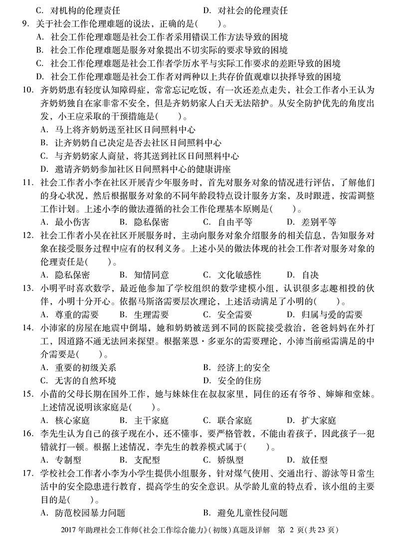 2017年助理社会工作师《社会工作综合能力(初级)》真题及详解(共23页)