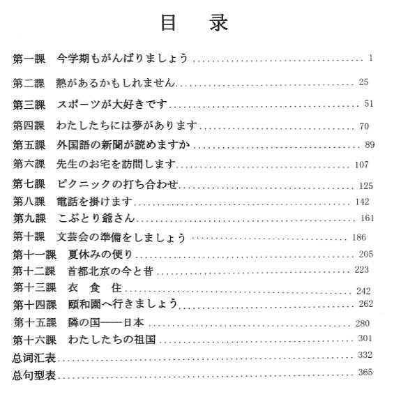 本书共由16课构成,每课主要由下面七个部分组成。 [本文]——是教材的核心,也是教材的重点。全部由编者自编的会话体课文组成。编写的原则是:贯彻听说领先的教学方针,内容贴近生活,健康实用,语言规范,注重口语,结合实际,学以致用。 [要约文]——是对[本文]的补充,目的是为了加强学员的叙述能力和概括能力,培养学生掌握较复杂会话的技巧。同时,适当地增加了必要的词汇、语法和句型。 [単语]——按单词在课文中出现的先后顺序进行排列,标有音调符号、词性、词义。词义注释以课文中的意义用法为主,力求简明。为达到教委大纲对词汇量的要求,对一些使用频度较高而课文中又没有出现的常用词汇,采用分散出现在句型、语法、练习等部分中的形式进行了补充,并收入[补充単语]。本书[新出単语][要约文の単语][补充単语]三项共出现1997个单词,全部为必须掌握词汇。 [文法]——按照随时出现随时解释、过一段时间再加以比较系统地小结的方式对语法现象进行了说明、归纳。语法术语和词类定性均采用教委大纲的统一提法,个别地方加有标注。日语语法中的主要项目如助词、助动词、副词、接续词、敬语等基本语法现象已经出现并进行了解释和小结。语法说明参考和汲取了国内外语法研究的新成果。 [文型]——从意义、形态、接续法和汉译等几个方面对句型进行了解释,指明了规律,并附有典型例句。本书共出现99个句型,要求全部掌握、灵活运用。 [言叶の解释]——对于一些难解词汇、具有日本独特文化背景的词汇、容易用错或词义相近但用法又不尽相同、有时甚至大不相同的词汇进行了解释、归纳和比较、指明注意事项,以利于正确掌握和运用。 [练习]——作业习题是掌握和消化所学课文的重要手段,因此在设计和制作习题时、充分考虑了题型的多样化、覆盖面和科学性,力求量大、面宽。包括语法点、句型、词汇用法、课文内容等,既有笔头练习,也有口头练习。 为了教学方便,练习答案末附在书后。需要练习答案和录音磁带的读者,请直接与北京第二外国语学院日语系联系。 本书书末附有[总词汇表]和[句型表],以供查阅。全书拟有192课时授完。