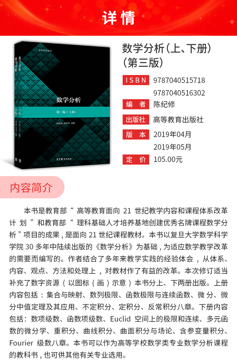 陈纪修《数学分析》(第3版)(上、下册)教材(高等教育出版社)