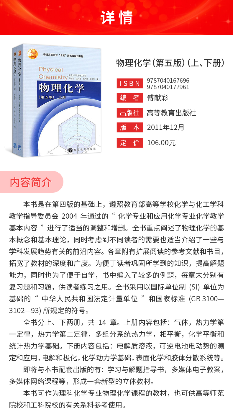 傅献彩《物理化学》(第5版)(上、下册)教材(高等教育出版社)