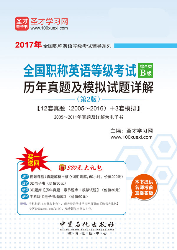 圣才学习网│英语类提供全国职称英语等级考试辅导方案【视频课程、3D电子书、3D题库等】。购书享受大礼包增值服务【200元视频课程+30元3D电子书+30元3D题库+60元手机版电子书/题库】。本书提供名师考前直播答疑,手机电脑均可观看,直播答疑在考前推出(具体时间见网站公告)。手机扫码(本书封面的二维码),或者登录圣才学习网首页的【购书大礼包】专区,免费领取本书大礼包。